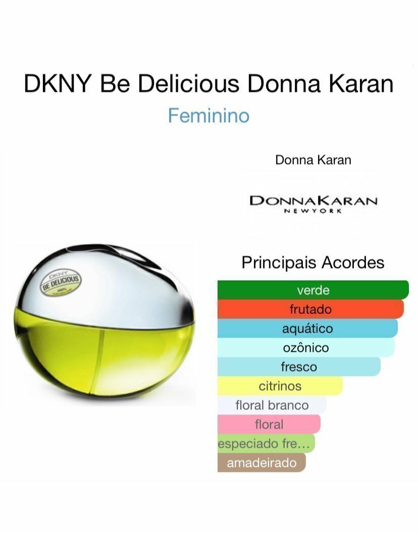 DKNY Be Delicious de Donna Karan é um perfume Floral Frutado Feminino. DKNY Be Delicious foi lançada em 2004. O perfumista que assina esta fragrância é Maurice Roucel. As notas de topo são: Pepino, Toranja e Magnólia. As notas de coração são: Maçã Verde, Lírio-do-Vale, Tuberosa, Violeta e Rosa. As notas de fundo são: Notas Amadeiradas, Sândalo e Âmbar.