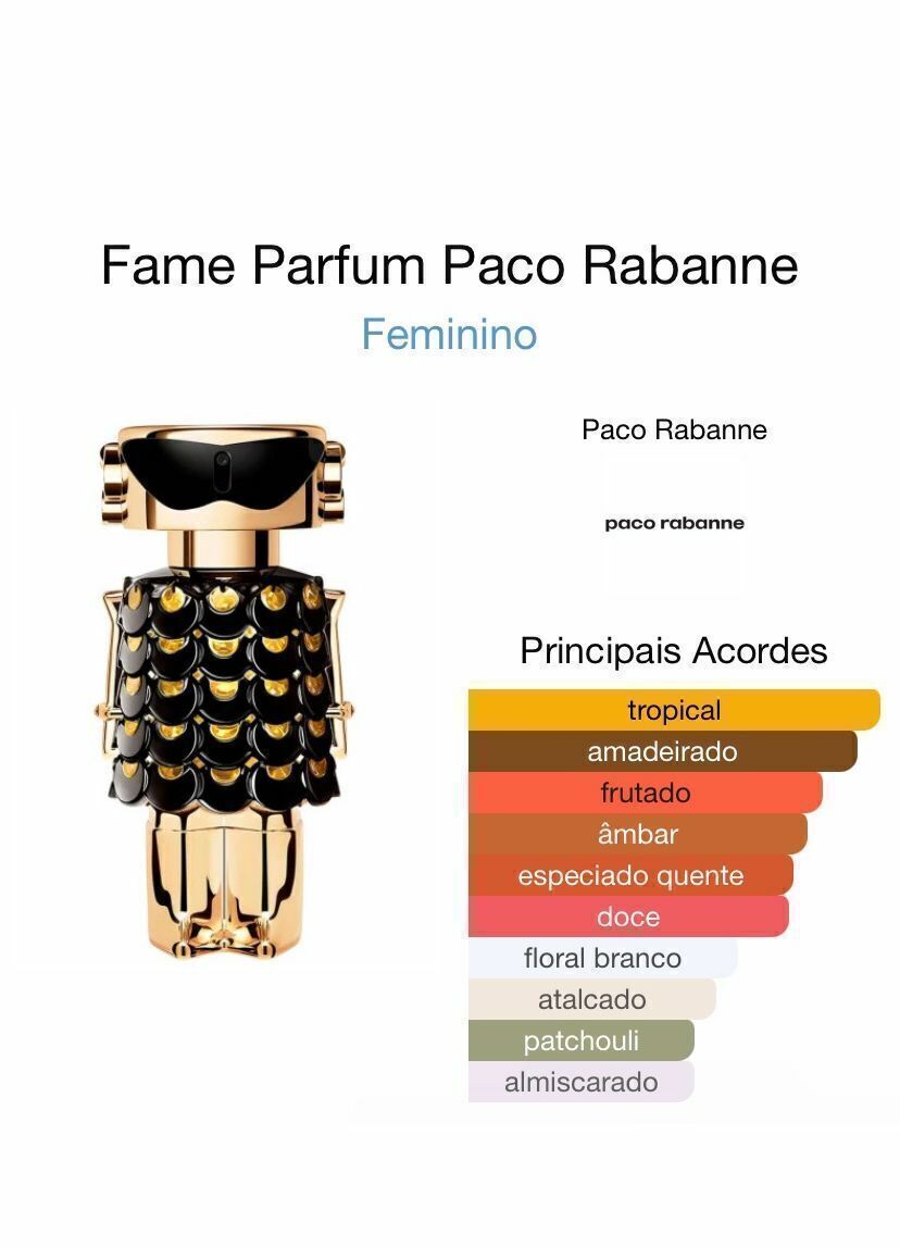 Fame Parfum de Rabanne é um perfume Floral Frutado Gourmet Feminino. Esta é uma nova fragrância. Fame Parfum foi lançada em 2023. Fame Parfum foi criado por Alberto Morillas, Dora Baghriche e Marie Salamagne. As notas de topo são: Manga, Pimenta Rosa e Bergamota. As notas de coração são: Jasmim, Patchouli e Olíbano. As notas de fundo são: Sândalo, Benjoim, Almíscar e Helvetolide®.