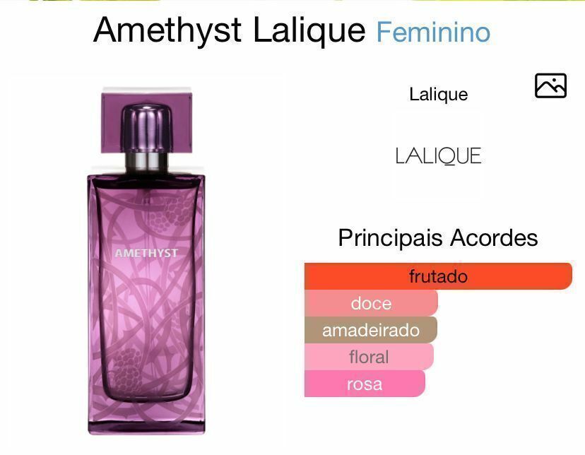 Amethyst de Lalique é um perfume Floral Frutado Feminino. Amethyst foi lançada em 2007. O perfumista que assina esta fragrância é Nathalie Lorson. As notas de topo são: Groselha Preta, Amora, Mirtilo, Amoreira e Morango. As notas de coração são: Peônia, Pimenta, Rosa e Ylang Ylang. As notas de fundo são: Almíscar, Notas Amadeiradas e Baunilha de Bourbon.